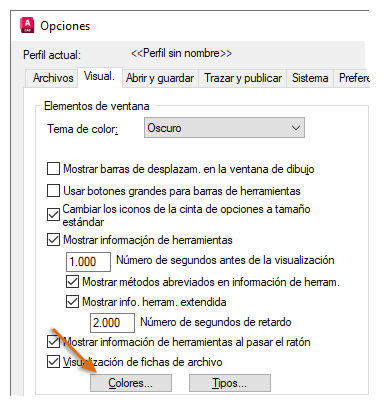 Personaliza los parámetros del programa. Utilice la ficha Dibujo para cambiar el color y el tipo de letra utilizados en la ventana de la línea de comando.