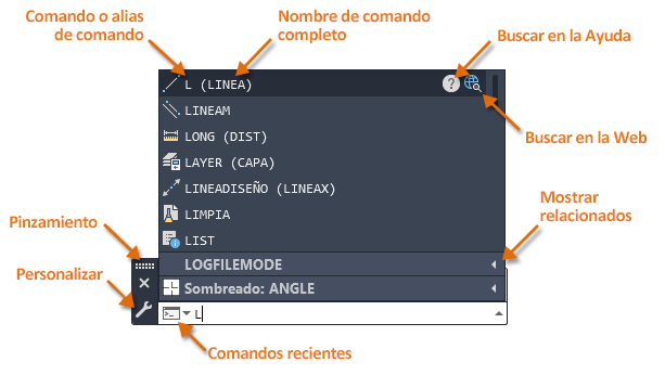 Al empezar a escribir, por ejemplo, la letra L, se muestran los comandos y las variables de sistema disponibles en una lista. Esto recibe el nombre de lista de Autocompletar. A continuación, puede elegir el comando o la variable de sistema que desea utilizar.