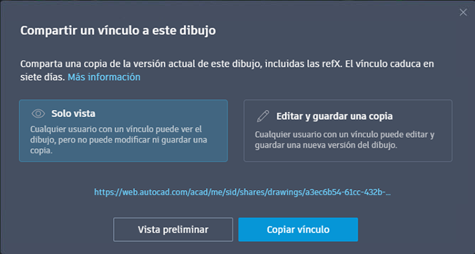 El comando COMPARTA empaqueta el archivo y todas sus referencias como una dirección URL que se puede abrir en la aplicación web de AutoCAD. Cualquier usuario con el vínculo podrá abrir el dibujo en la Web. El vínculo caduca después de siete días.
