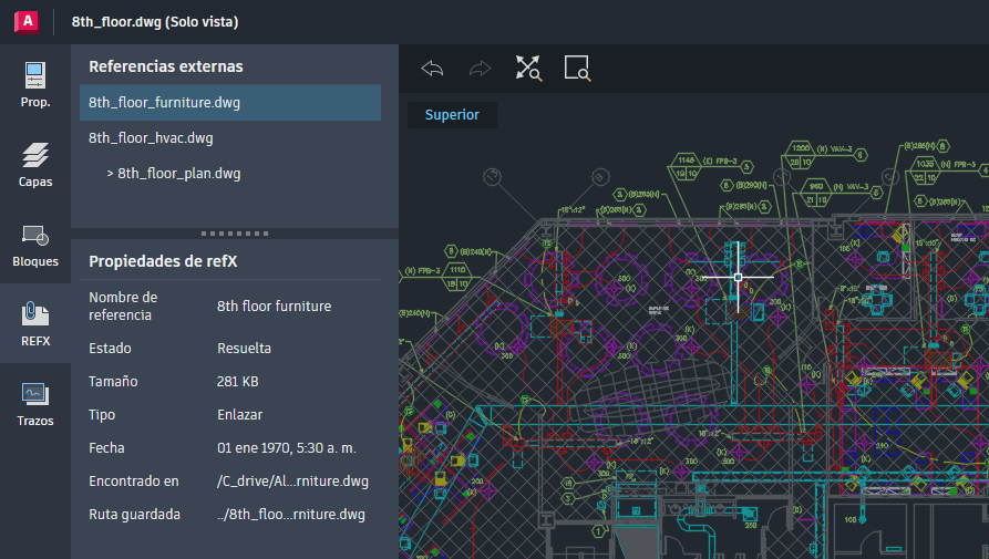 Los dibujos solo de vista se etiquetan como "Solo vista" y observará que las herramientas Guardar, Trazar y de dibujo se han desactivado. Si el dibujo se ha compartido con permisos para editar y guardar, cuando el usuario guarda el dibujo en la ubicación especificada, las referencias asociadas al dibujo se guardarán en esa misma ubicación.