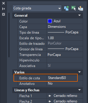 El estilo de cota se muestra como Standard$0, ya que es un subestilo.