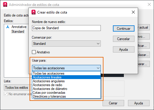 En el cuadro de diálogo Crear estilo de cota, haga clic en la lista desplegable Usar para y seleccione Acotaciones lineales.