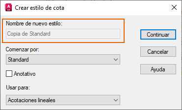 Nota: Al seleccionar un tipo de cota específico, el cuadro de texto Nombre de nuevo estilo se desactiva, ya que es un subestilo del estilo de cota seleccionado con el que ha empezado.
