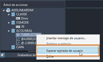 Con el grupo Grabadora de acciones expandido y el Árbol de acciones visible, seleccione el valor de cadena grabado Cotas en la variable de sistema CLAYER y haga doble clic en él; a continuación, escriba el nuevo valor Acota.
