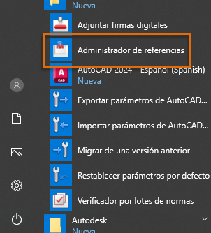 Puede iniciar el Administrador de referencias desde el menú Inicio de Windows. Para ello, haga clic en Autodesk > AutoCAD versión > Administrador de referencias.