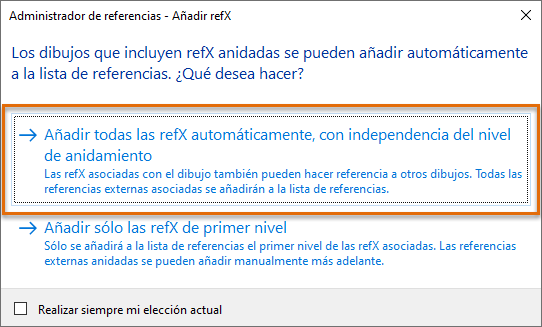 En el cuadro de diálogo Administrador de referencias - Añadir refX, haga clic en Añadir todas las refX automáticamente, con independencia del nivel de anidamiento.