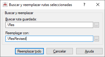Haga clic en Buscar y reemplazar para mostrar el cuadro de diálogo Buscar y reemplazar rutas seleccionadas.