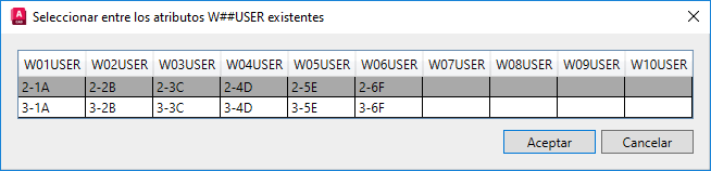 - Haga clic en "Elija uno de los atributos W##USER existentes en el proyecto para este número de cable" para mostrar una tabla con los atributos de usuario existentes que se pueden seleccionar para este número de cable.
