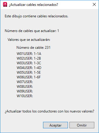 - Si los cables relacionados están presentes en el mismo dibujo, haga clic en Aceptar para actualizar los demás bloques de números de cable de la red que comparten el mismo número de cable. Haga clic en OMITIR si desea excluir los demás bloques de números de cable de la actualización en la red.