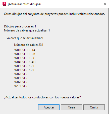 - Si los cables relacionados se encuentran en diferentes dibujos, haga clic en Aceptar para actualizar los demás bloques de números de cable que tengan el mismo número de cable en la red en todos los dibujos. Haga clic en TAREA para actualizar los mismos bloques de número de cable en otros dibujos, lo que permite realizar la actualización posteriormente. Haga clic en OMITIR si desea excluir los demás bloques de números de cable de la actualización en la red.
