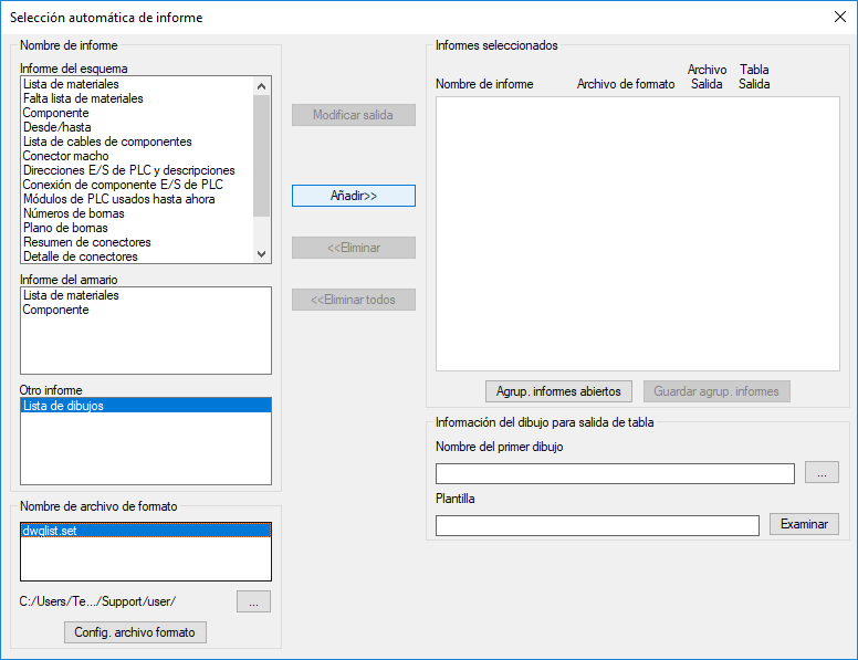 En el cuadro de diálogo Selección automática de informes, en Otro informe, haga clic en Lista de dibujos y seleccione un archivo .set .