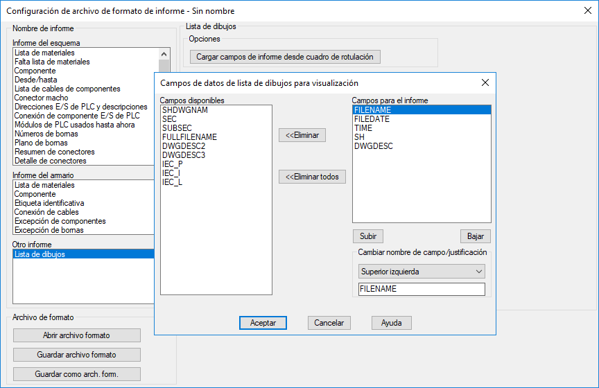 Si necesita campos adicionales de los cuadros de rotulación, además de las opciones por defecto, haga clic en Cargar campos de informe desde cuadro de rotulación.