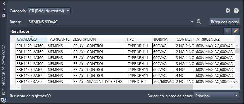 Por ejemplo, al hacer clic en Búsqueda en una bobina de relé sin un valor de catálogo, desea que el Explorador de catálogos busque números de pieza Siemens de relés de "600 V de CA". Edite el archivo de base de datos de catálogo y seleccione la tabla _LISTBOX_DEF. Inserte un registro con los siguientes valores de campos: