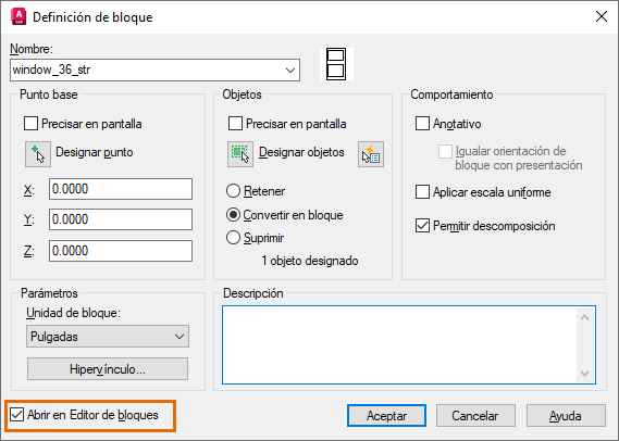 En este artículo, creará un bloque de ventana que comience con una anchura de 36" por una altura de 72" y, a continuación: