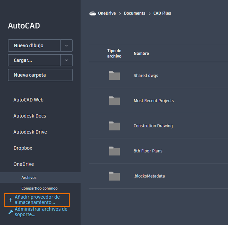 Nota: Las aplicaciones web y para dispositivos móviles de AutoCAD se pueden conectar a cualquiera de los siguientes proveedores de almacenamiento: