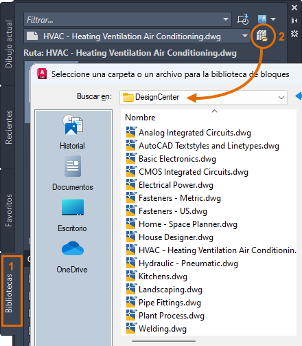 - Para elegir un dibujo de biblioteca diferente de la carpeta DesignCenter, asegúrese de que la ficha Bibliotecas sea la actual (1) y haga clic en el botón de navegación de archivos (2).