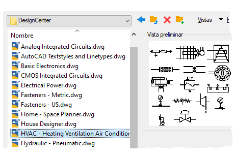 Cada dibujo de la carpeta DesignCenter contiene un conjunto de definiciones de bloque relacionadas.