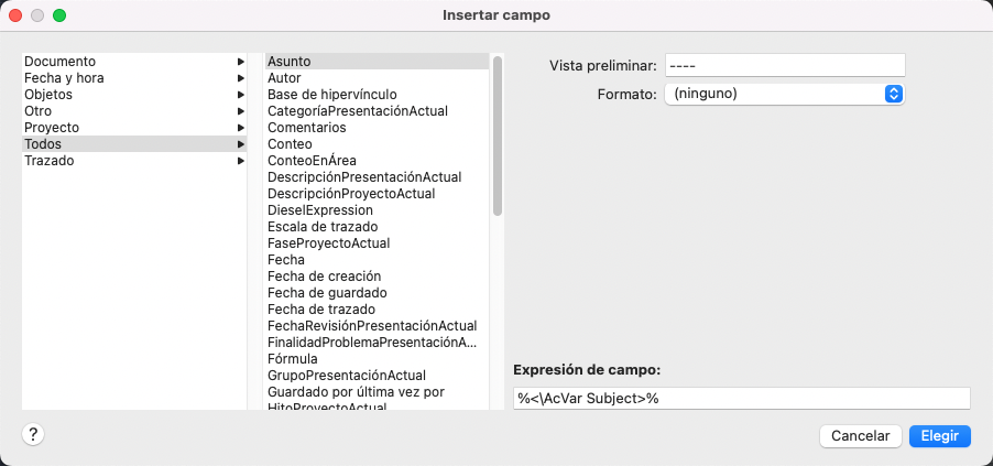 Muestra una lista de los campos que están disponibles en una categoría. Seleccione un nombre de campo para visualizar las opciones disponibles para ese campo.