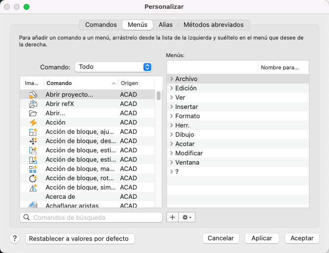 Muestra los menús disponibles en la barra de menús de Mac OS. Expanda un menú para ver los comandos y los submenús asignados al menú.