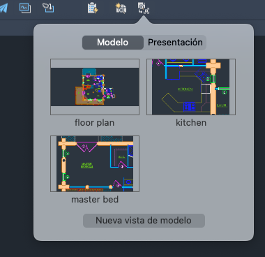 Si el espacio modelo está activo, al seleccionar cualquier vista guardada, se cambia a esa vista. Haga clic en Nueva vista de modelo para crear una vista y añadirla a la galería de vistas.