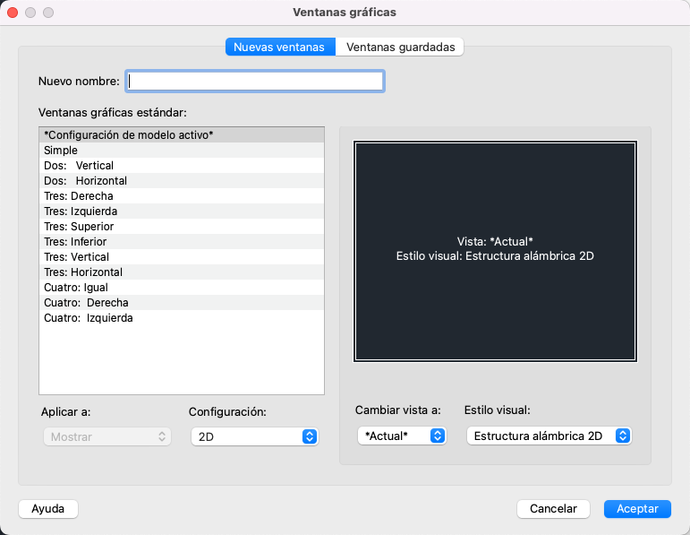 Muestra una lista de configuraciones de ventana gráfica estándar y configura ventanas gráficas de presentación.