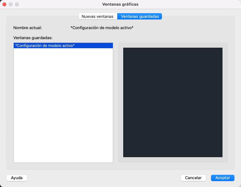 Muestra una vista preliminar de la configuración de ventana gráfica seleccionada y las vistas por defecto asignadas a cada ventana gráfica individual de la configuración.