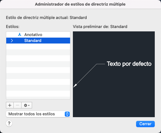 Muestra el nombre del estilo de directriz múltiple que se aplica a las directrices múltiples que se crean. El estilo de directriz múltiple por defecto es Standard.