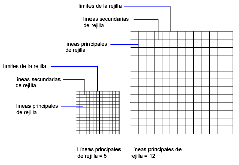 Si la rejilla se muestra como líneas y no como puntos, se muestran a intervalos líneas más oscuras, llamadas líneas de rejilla principales . Cuando se trabaja con unidades decimales o con pies y pulgadas, las líneas de rejilla principales resultan especialmente útiles para medir rápidamente las distancias. Puede controlar la frecuencia de las líneas de rejilla principales en el cuadro de diálogo Parámetros de dibujo.