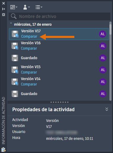 El historial de DWG se ha incluido en la herramienta Información de actividad. Por lo tanto, cuando se guarda un archivo en un proveedor de almacenamiento en la nube compatible, como Autodesk Docs, Google Drive, OneDrive, Box y Dropbox, aparece una nueva versión del archivo como actividad de versión en la paleta Información de actividad. Haga clic en Comparar en la actividad de versión para ver las diferencias entre la versión actual y la anterior.