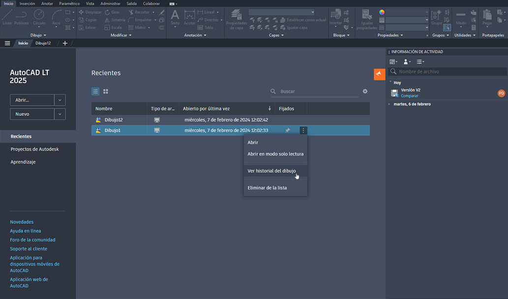 También se pueden ver las distintas versiones de un dibujo sin necesidad de abrir el archivo. En la ficha Inicio, haga clic en Recientes y seleccione el dibujo. A continuación, haga clic en los puntos suspensivos verticales y seleccione Ver historial del dibujo para ver las actividades del dibujo en la paleta anclada.