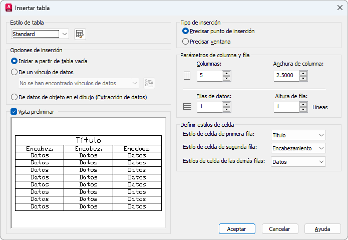 Controla si se muestra una vista previa. Si comienza a partir de una tabla vacía, la vista previa mostrará un ejemplo del estilo de tabla. Si crea un vínculo de tabla, la vista previa mostrará la tabla resultante. Si desea mejorar el rendimiento al trabajar con tablas grandes, desactive esta opción.