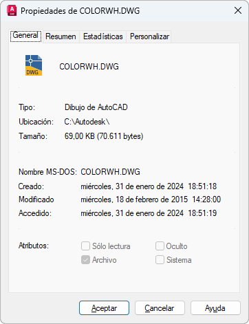 Muestra información de solo lectura sobre el archivo de dibujo, la cual se deriva del sistema operativo.