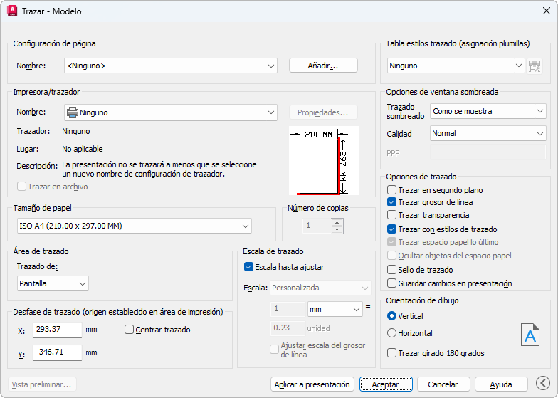 Controla el tamaño relativo de las unidades de dibujo respecto a las unidades de trazado. El valor de escala por defecto es 1:1 cuando se traza una presentación. Si se imprime desde la ficha Modelo, el valor por defecto es Escala hasta ajustar.