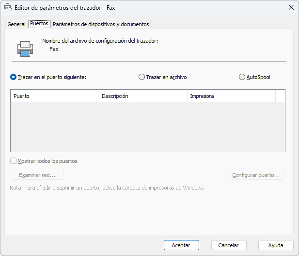 Muestra una lista de los puertos disponibles, tanto locales como de red, y una descripción. Si es un puerto de red, también aparece el nombre de la impresora de la red.