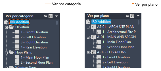 La ficha Lista de planos permite organizar los planos en colecciones denominadas subconjuntos. Por su parte, la ficha Vistas de plano permite organizar las vistas en colecciones denominadas categorías.