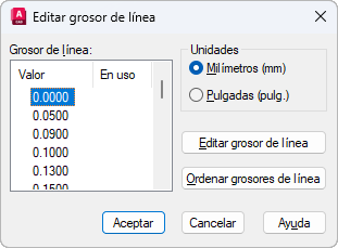 Presenta una lista con los grosores de línea de la tabla de estilos de trazado. Es posible modificar grosores de línea existentes, pero no añadirlos ni suprimirlos. Si cambia un valor de grosor de línea, también cambian otros estilos de trazado que utilicen grosor de línea.