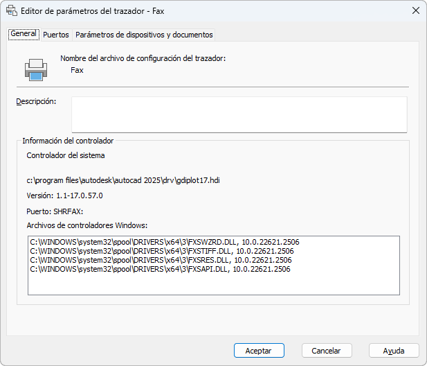 - El nombre de la impresora del sistema (si el trazador configurado es la impresora del sistema).