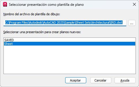 Especifica la ruta de la carpeta, el archivo de plantilla de dibujo (DWT) y el nombre de la presentación que se deben usar para crear nuevos planos.