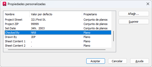 Enumera las propiedades personalizadas asociadas con el conjunto de planos actual.