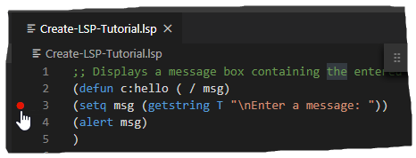 The following steps explain how to add breakpoints to the Create-LSP-Tutorial.lsp file open in the current editor window.