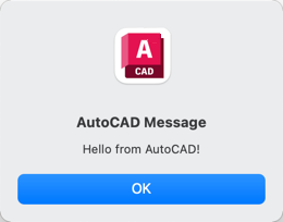 A message box appears with the text "Hello from AutoCAD!".