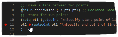 After you create an AutoLISP (LSP) file and add code statements to the file, you can connect Visual Studio Code to AutoCAD and step through your custom functions using many of the debug tools that Visual Studio Code offers.