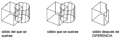 Combina sólidos 3D o regiones 2D designados por sustracción.