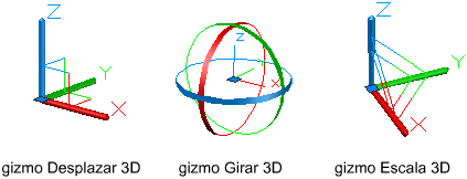 Al designar un objeto en una vista 3D, se muestra el gizmo por defecto. Puede cambiar el valor de la variable de sistema DEFAULTGIZMO. También es posible suprimir la visualización de los gizmos al designar objetos.