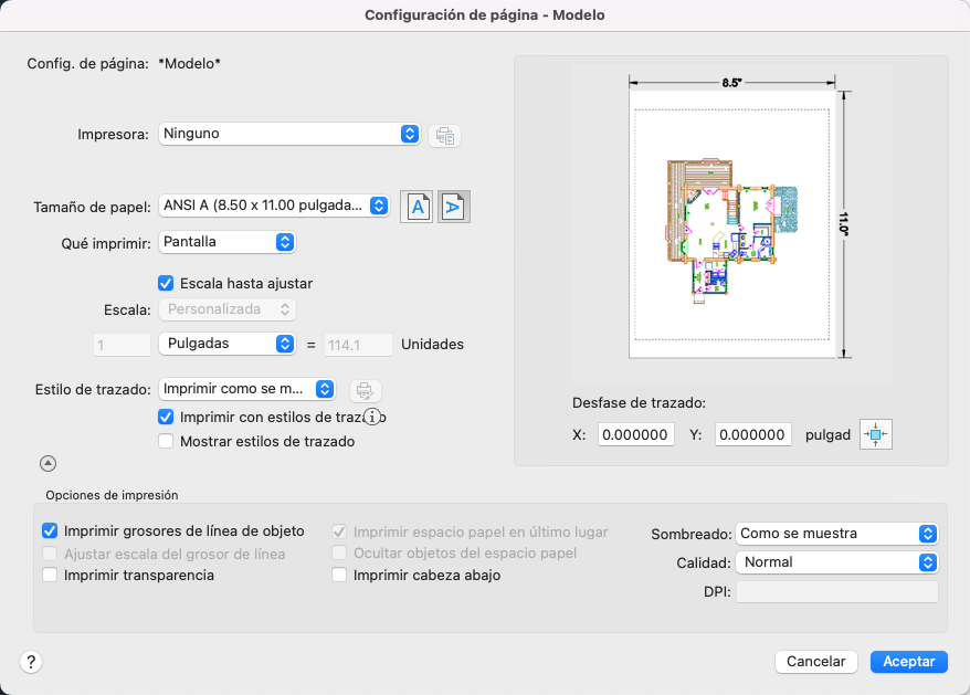 Define la escala del trazado de manera que se ajuste al tamaño de papel seleccionado y muestra el factor de escala personalizado en los cuadros Escala, Pulgada(s) = y Unidades.