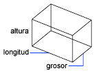 Crea un prisma rectangular con los valores de longitud, anchura y altura especificados. La longitud corresponde al eje X, la anchura, al eje Y y la altura, al eje Z.
