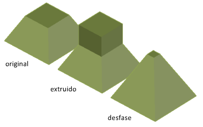 Al aplicar una operación de pulsar o tirar a una cara, se desfasa la cara y se ajusta la geometría adyacente. Puede pulsar la tecla Ctrl para alternar entre los modos de desfase y extrusión.