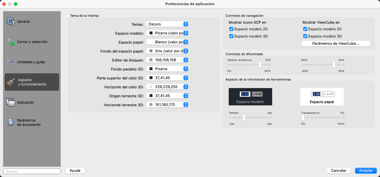 Controla el tema que aplicar a elementos como la barra de estado, las paletas y las ventanas de dibujo. Puede elegir entre un tema oscuro y uno claro.