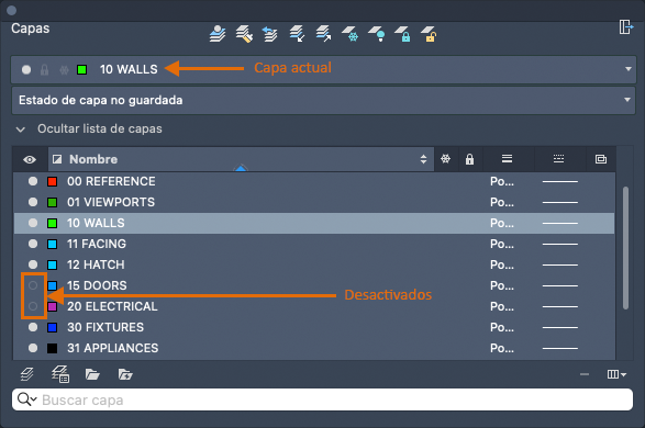 Las capas organizan el dibujo, lo que le permite suprimir temporalmente la visualización de los datos gráficos que no se necesiten. También puede asignar las propiedades por defecto, como el color y el tipo de línea, a cada capa.