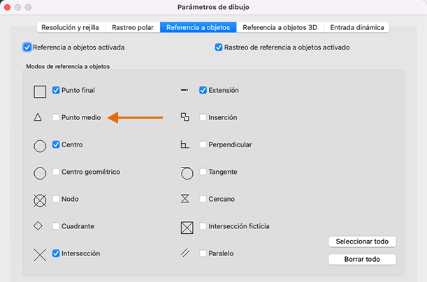 Escriba el comando REFENT para definir la referencia a objetos por defecto, que también se denomina referencia a objetos "en ejecución". Por ejemplo, puede resultar muy útil activar la referencia a objetos de punto medio por defecto.
